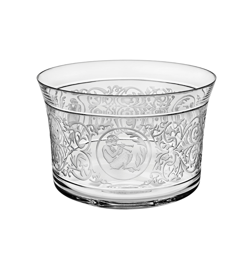 Qabın mərkəzində əl ilə qum tökmə və almaz çubuğu vasitəsilə böyük həssaslıqla çəkilmiş Yunan-Roma mifologiyasında Pan fleyta oynayan keçi ayaqlı bir məxluq tapırıq.