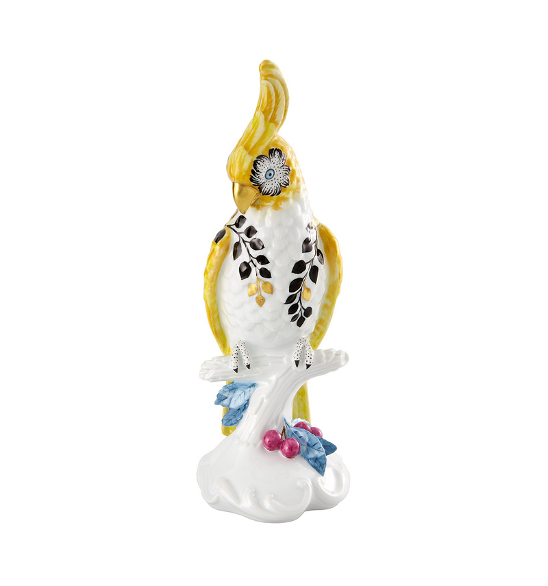 Candlestick Cockatoo Right Primavera. Magenta dahlias, crimson poppies and buttercup yellow pansies mingle with lush vegetation that seems to be escaping from a labyrinth of immaculate stripes.