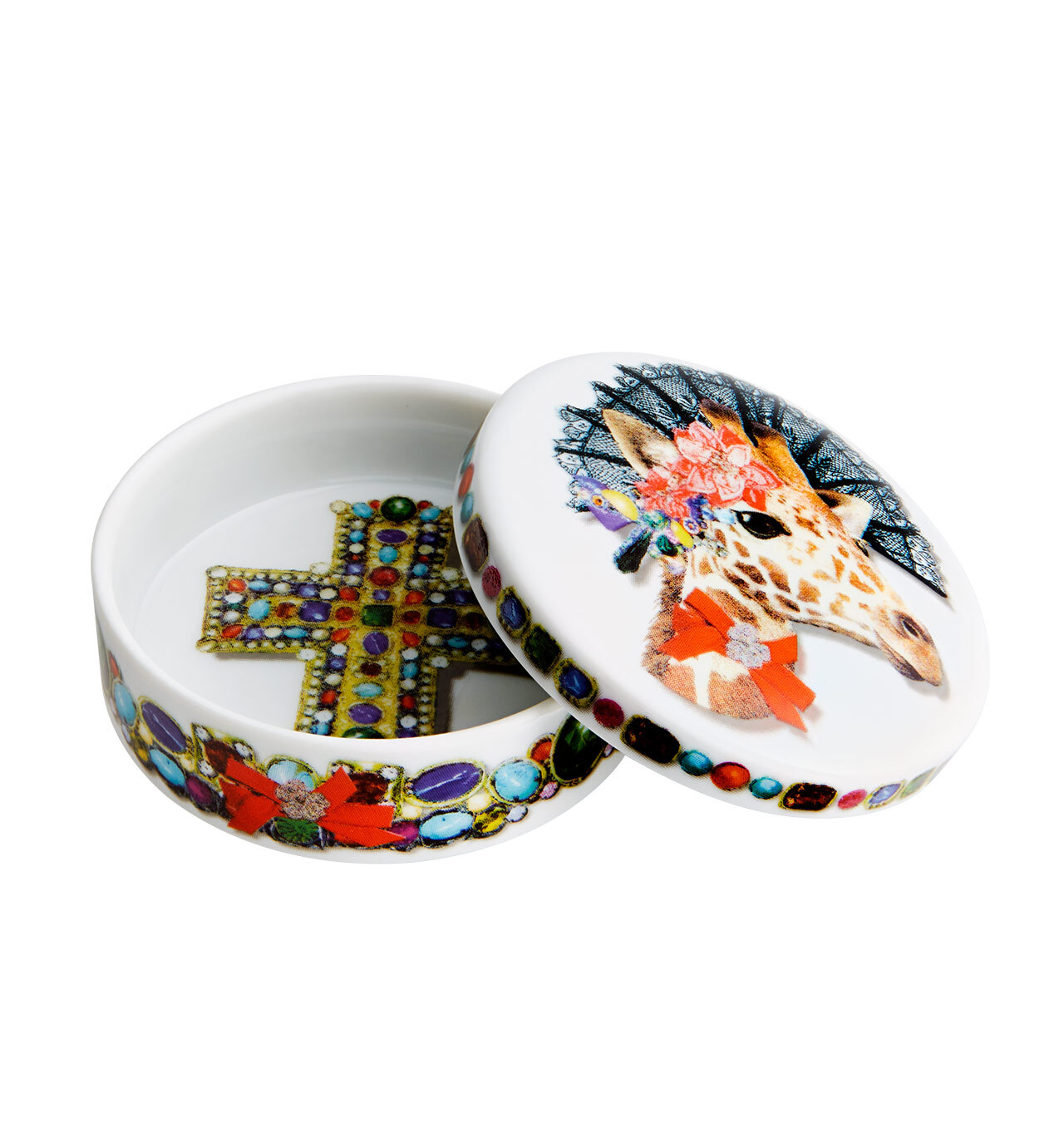 Small Round Box Doña Jirafa Love Who You Want. Intermingling contemporary and haute couture designs of the house of Christian Lacroix, the new Christian Lacroix Maison - Vista Alegre gift collection is composed of various items representing exuberant and extraordinary personalities, such as “Mister Tiger” or “Doña Jirafa”, clearly illustrative of the unique imagination of the French brand.